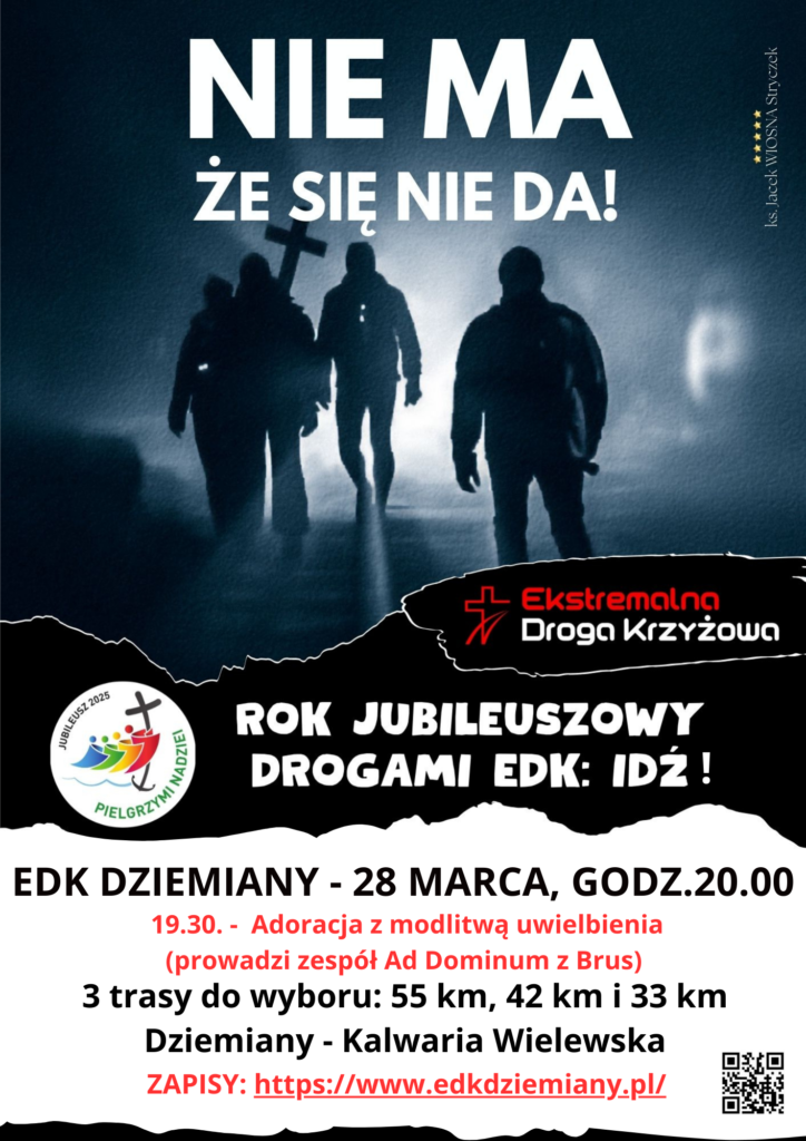 Parafia św. Antoniego w Dziemianach zaprasza do udziału w jubileuszowej X Ekstremalnej Drodze Krzyżowej z Dziemian na Kalwarię Wielewską, która odbędzie się w piątek 28 marca. Od godz. 19.30 będzie okazja do spowiedzi i adoracja z modlitwą uwielbienia, którą poprowadzi zespół Ad Dominun z parafii  z Brus, a następnie o godz. 20.00. Msza św. na rozpoczęcie EDK. Tegoroczna edycja przypada w Roku Jubileuszowym, stąd ta nocna wyprawa w duchu pokuty i nawrócenia jest jedną z kluczowych form przeżywania Roku Jubileuszowego. Po dotarciu do kościoła wielewskiego będzie można uzyskać odpust zupełny. Więcej informacji i zapisy na stronie:  https://www.edkdziemiany.pl/.