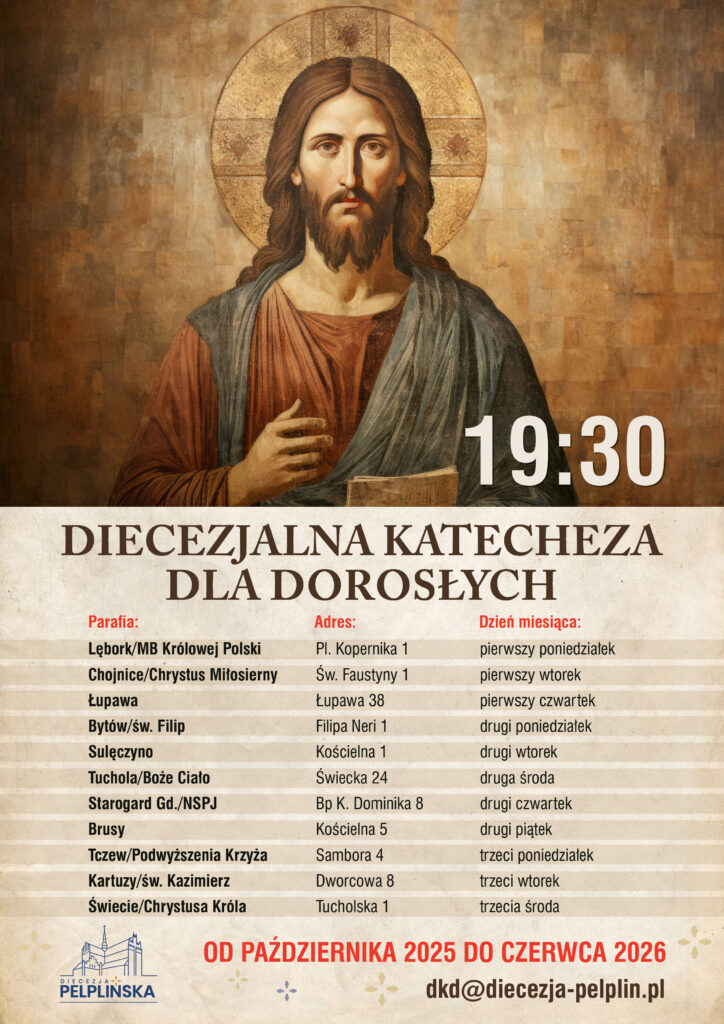Drugi cykl katechez dla dorosłych będzie miał miejsce od października 2025 r. do czerwca 2026 r. raz w miesiącu w jedenastu parafiach diecezji. Najbliższym punktem tych katechez to parafia Brusy. Tam spotkania odbywać się będą w drugi piątek miesiąca. Spotkania rozpoczynają się o godzinie 19.30 i kończą Apelem Jasnogórskim. Tematem drugiego cyklu będzie Eucharystia. Katecheza adresowana jest do wszystkich wiernych. Jest to okazja do modlitwy, zatrzymania się przy Słowie Bożym, dyskusji i zapoznania się z bieżącymi wydarzeniami wyznaczającymi rytm duszpasterski życia diecezji.