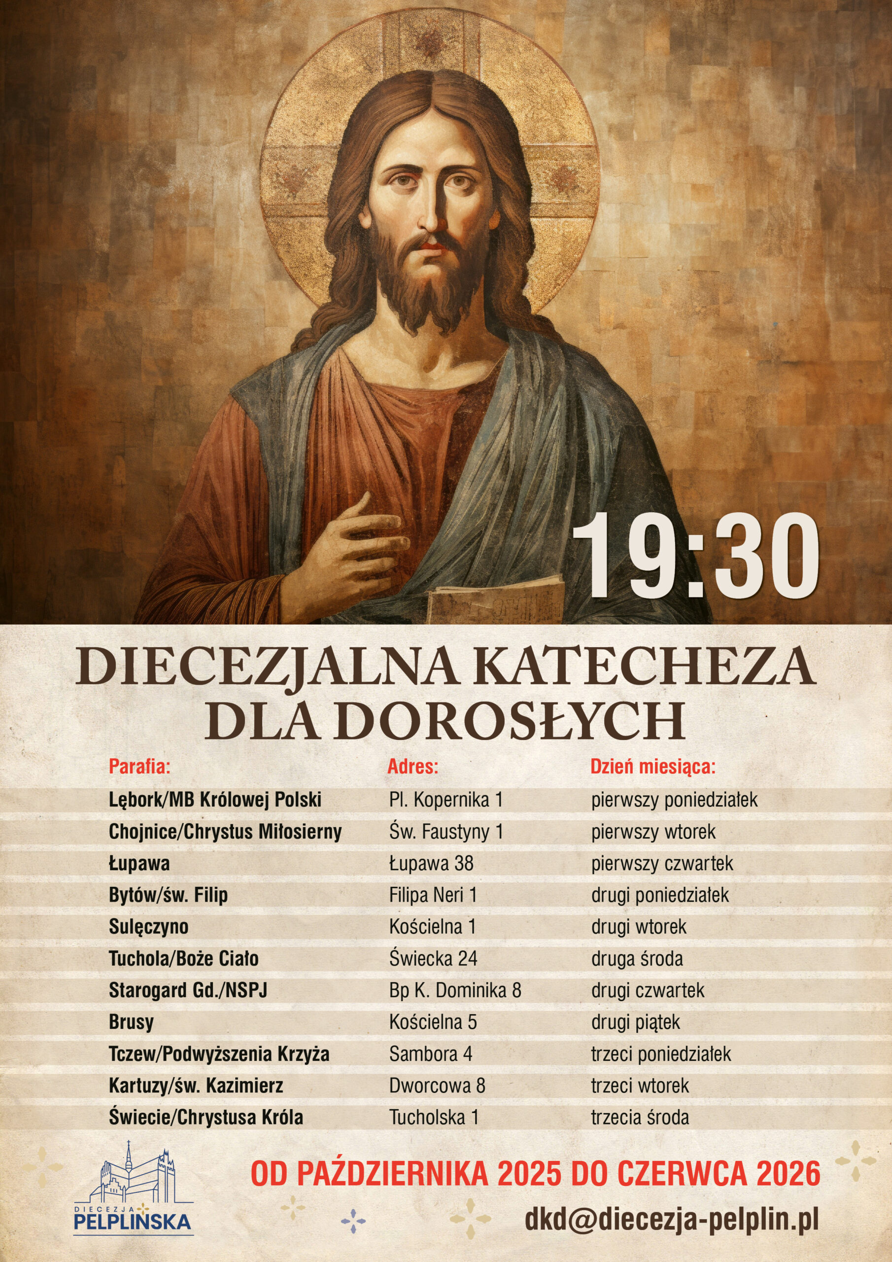 Drugi cykl katechez dla dorosłych będzie miał miejsce od października 2025 r. do czerwca 2026 r. raz w miesiącu w jedenastu parafiach diecezji. Najbliższym punktem tych katechez to parafia Brusy. Tam spotkania odbywać się będą w drugi piątek miesiąca. Spotkania rozpoczynają się o godzinie 19.30 i kończą Apelem Jasnogórskim. Tematem drugiego cyklu będzie Eucharystia. Katecheza adresowana jest do wszystkich wiernych. Jest to okazja do modlitwy, zatrzymania się przy Słowie Bożym, dyskusji i zapoznania się z bieżącymi wydarzeniami wyznaczającymi rytm duszpasterski życia diecezji.