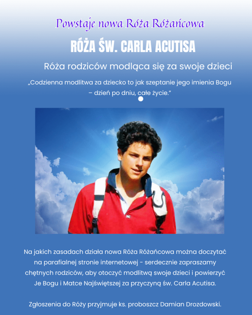 W naszej parafii zrodziło się pragnienie, aby powstała nowa Róża Różańcowa Rodziców modlących się za swoje dzieci. Chcemy zjednoczyć nasze rodziny przez modlitwę w nowej Róży świętego Carla Acutisa. Rodziców, którzy chcieliby modlić się za swoje dzieci zapraszam do zapisów. Szczegóły działania tej Róży znajdziemy poniżej: