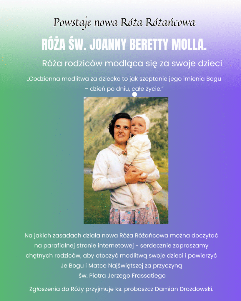 19.10.2025 r. rozpoczęła swoją misję modlitwy Róża Rodziców modląca się za swoje dzieci. im. św. Carla Acutisa. Dnia 26.10.2025 r. rozpocznie swoją misję modlitwy Róża Rodziców modląca się za swoje dzieci im. Piotra Jerzego Frassatiego. Zbieramy chętnych rodziców do tak wielkiego dzieła, aby stworzyć Różę trzecią im. św. Joanny Beretty Molla. Mamy już 7 osób do nowej Róży. Serdecznie zachęcamy.