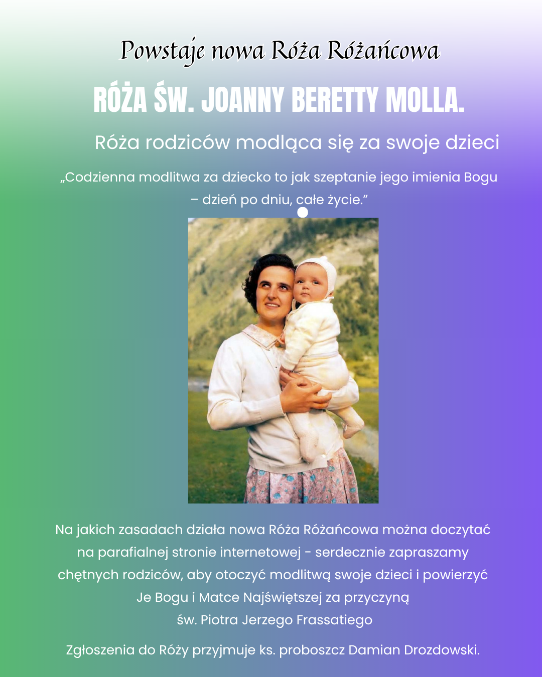 19.10.2025 r. rozpoczęła swoją misję modlitwy Róża Rodziców modląca się za swoje dzieci. im. św. Carla Acutisa. Dnia 26.10.2025 r. rozpocznie swoją misję modlitwy Róża Rodziców modląca się za swoje dzieci im. Piotra Jerzego Frassatiego. Zbieramy chętnych rodziców do tak wielkiego dzieła, aby stworzyć Różę trzecią im. św. Joanny Beretty Molla. Mamy już 7 osób do nowej Róży. Serdecznie zachęcamy.
