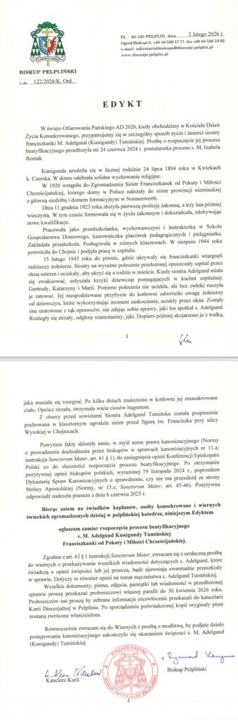 W święto Ofiarowania Pańskiego, 2 lutego 2026 r. biskup pelpliński Ryszard Kasyna wydał edykt, w którym ogłosił zamiar rozpoczęcia procesu beatyfikacyjnego s. M. Adelgund Kunigundy Tumińskiej – Franciszkanki od Pokuty i Miłości Chrześcijańskiej. Jeżeli ktoś z parafian posiada jakieś materiały, dokumenty zdjęcia to poproszę o kontakt.