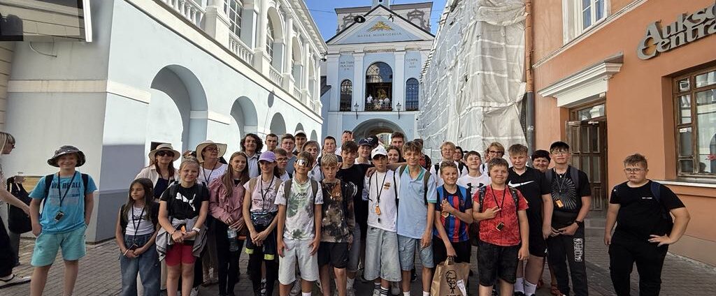 Wyprawę zaczęliśmy 30 czerwca 2025 roku. Zanim dojechaliśmy do Sejn odwiedziliśmy miejscowość Święta Lipka z przepięknymi organami. Po drodze wjechaliśmy do dawnej kwatery Hitlera „Wilczy Szaniec”. Następnego dnia zwiedziliśmy bazylikę w Sejnach i klasztor podominikański. Później pojechaliśmy do Augustowa, gdzie po zwiedzeniu miasta popłynęliśmy kanałem augustowskim. Na koniec pomodliliśmy się w sanktuarium Maryjnym w Studzienniczej. Trzeci dzień wyprawy to wyjazd na Litwę i zwiedzanie Wilna i Troków. Zobaczyliśmy piękne miejsca. Największe wrażenie wywarła na nas msza święta sprawowana w Ostrej Bramie. Odmówiliśmy tam koronkę do Miłosierdzia Bożego i każdy miał możliwość pomodlić się przed cudownym obrazem. Następnie udaliśmy się na cmentarz „Na Rosie”, gdzie spoczywają polscy żołnierze, serce marszałka Józefa Piłsudskiego i wielu wybitnych Polaków. Zwieńczeniem dnia było obejrzenie pięknego zamku w Trokach. Ostatni dzień to wyjazd do domu z fajnym relaksem w basenach w Mikołajkach. Pełni wrażeń wracamy do domu i dziękujemy Wszystkim, którzy w jakikolwiek sposób przyczynili się do naszej wycieczki.