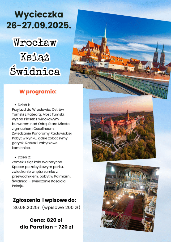 Nasza parafia organizuje wycieczkę w dniach 26-27.09.2025 roku. Zwiedzimy Wrocław, Książ i Świdnicę. Cena dla naszych parafian to 720 zł od osoby, pozostali chętni 820 zł. Zapisy w biurze parafialnym. Przy zapisach proszę przygotować adres i pesel. Wpisowe przy zapisie 200 zł.