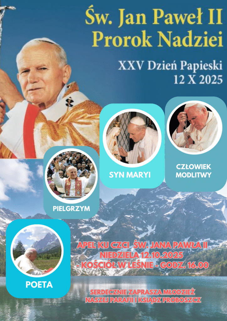 Zapraszamy w następną niedzielę do kościoła parafialnego na godz. 16.00. Młodzież przygotowała dla nas krótki montaż słowno-muzyczny poświęcony postaci naszego świętego papieża.